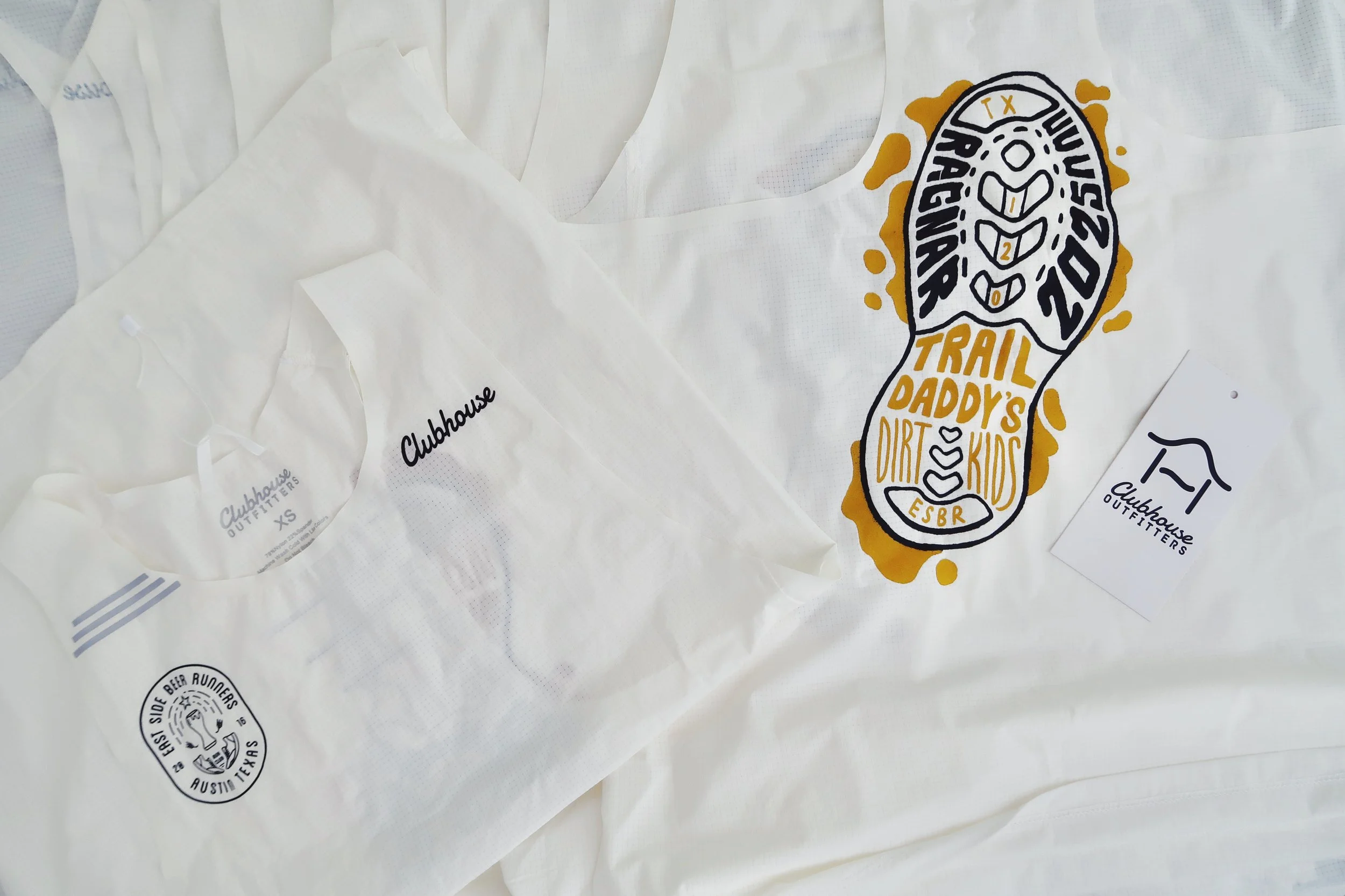 Clubhouse Outfitters Pace Pro Race Day Singlet laid out before the race with a “Trail Daddy’s Dirt Kids” design. Photo by Thira Rose, 2025.