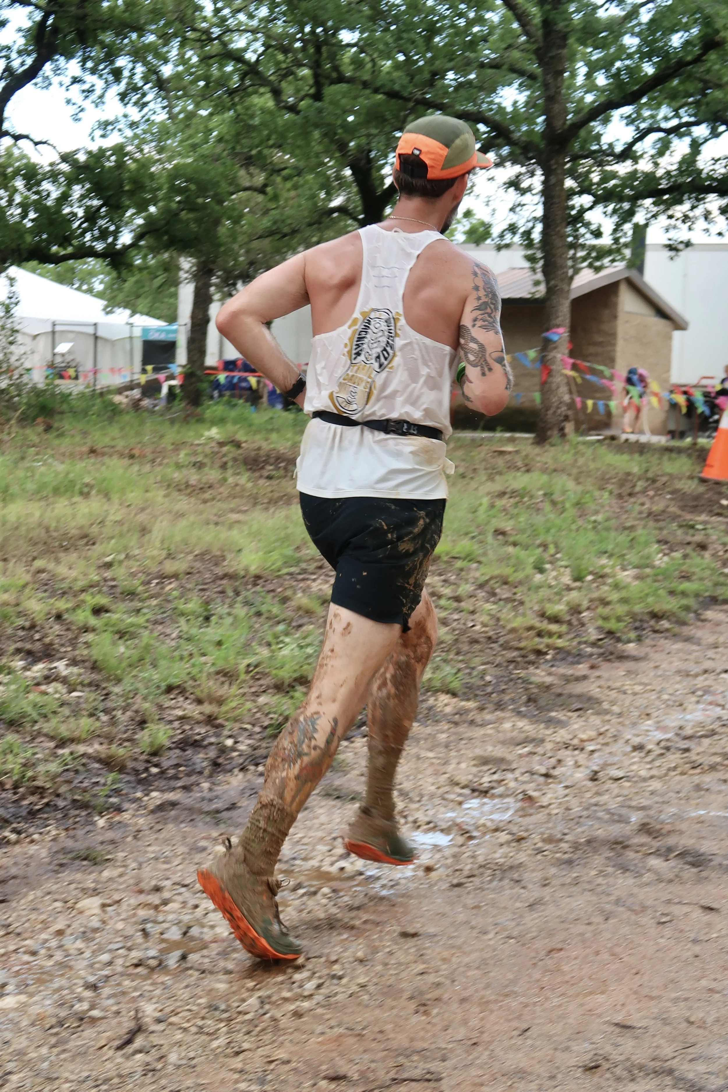 Runner nearing the finish line, wearing the Clubhouse Outfitters Pace Pro Race Day Singlet with a “Trail Daddy’s Dirt Kids” design. Photo by Thira Rose, 2025.