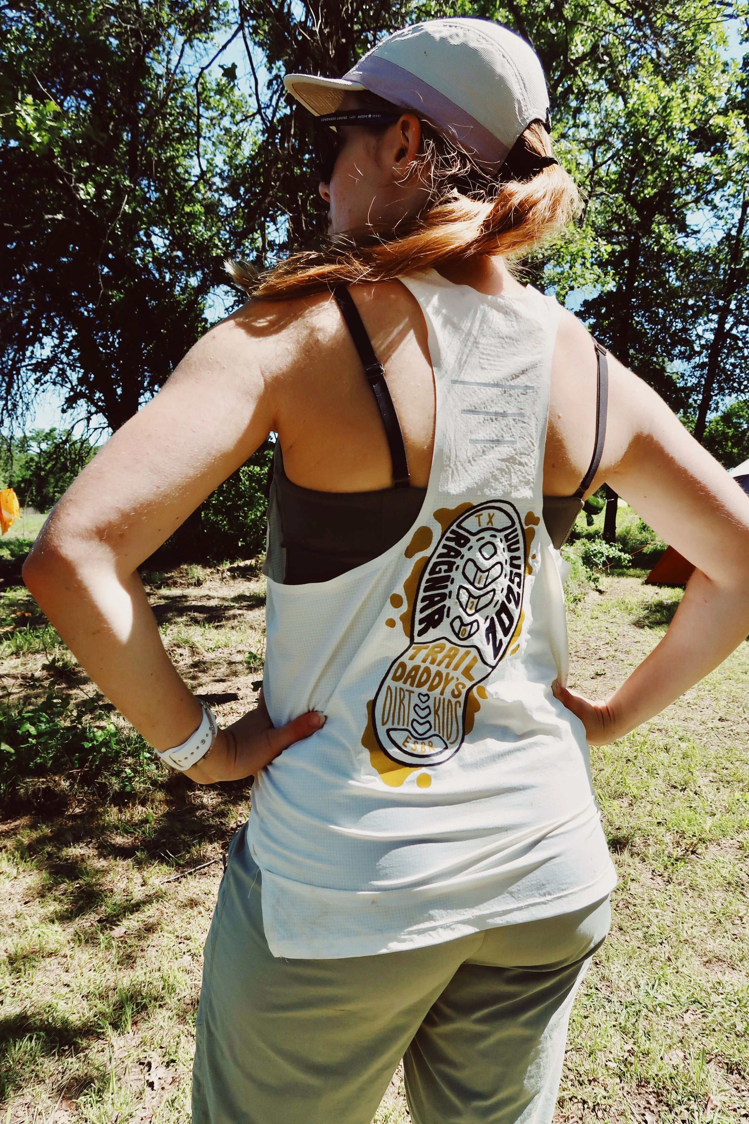 Thira Rose proudly wears the Clubhouse Outfitters Pace Pro Race Day Singlet with a “Trail Daddy’s Dirt Kids” design after completing the twenty-one-hour relay race. Photo by Caroline Hetitkamp, 2025.
