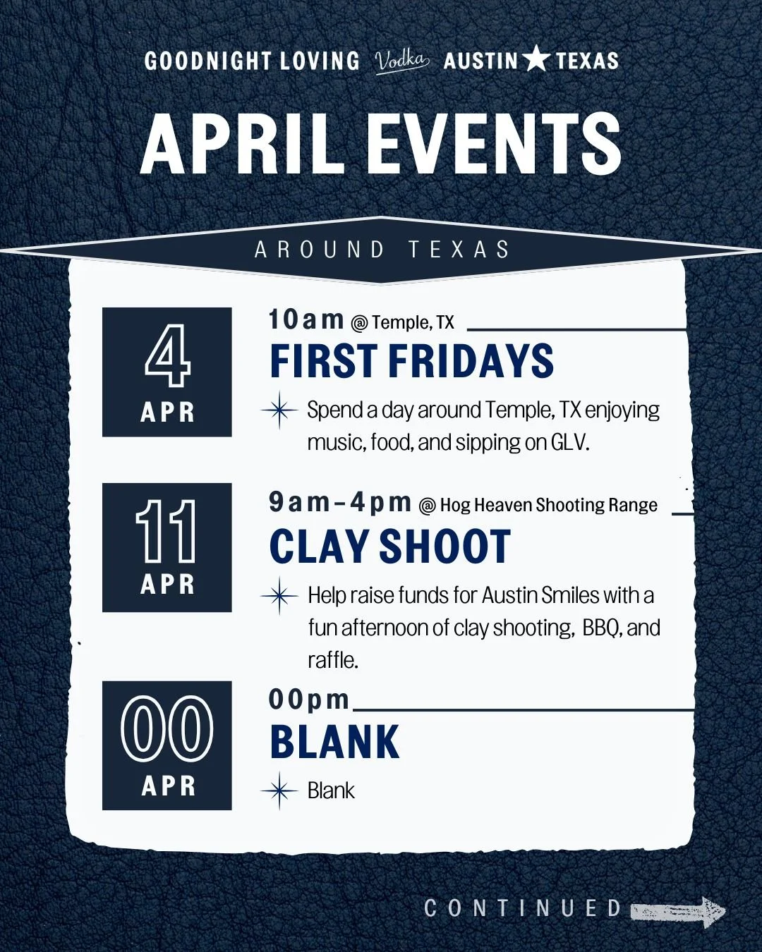 Goodnight Loving Vodka’s monthly event calendar serves as a guide to help promote charitable events, featured tastings, and local deals surrounding Texas’s most award-winning vodka. The calendar can be accessed on the Goodnight Loving Vodka Instagram page, Facebook page, and, eventually, the brand’s website.